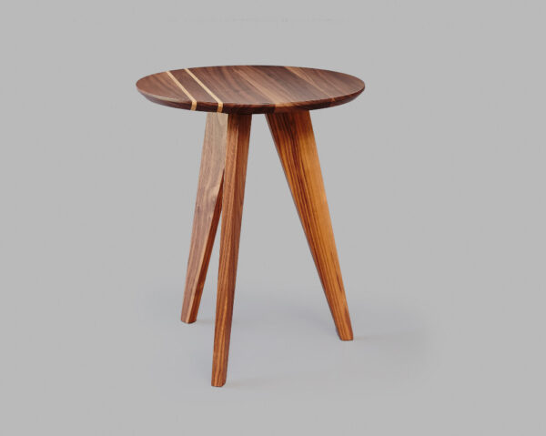 This round, 3-legged, walnut table with ash inlay is stylish and functional. Practical for pulling over when relaxing with a cup of tea or glass of wine. Ideal for a small space.