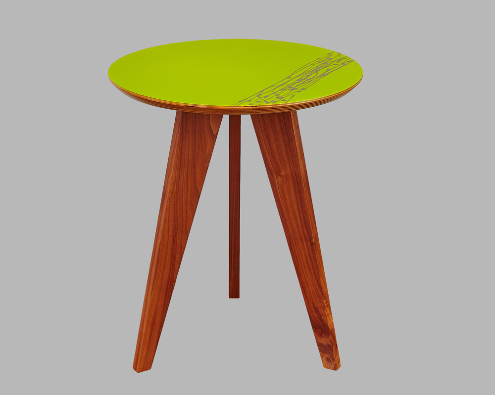 This 3-legged, walnut table with round, green lacquered top with a splash of grey, is stylish and functional. Practical for pulling over when relaxing with a cup of tea or glass of wine. Ideal for a small space.